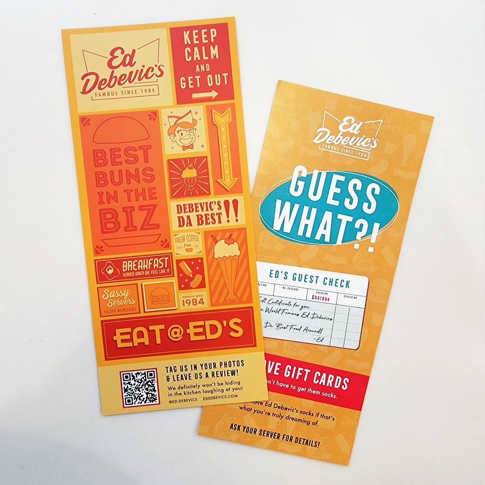 The visuals are heavily inspired by 50’s & 60’s motel signage and neons. Ed’s is a diner so that makes sense! Although this visual treatment is literally translated to physical signage within the restaurant, it is used heavily on the printed materials.