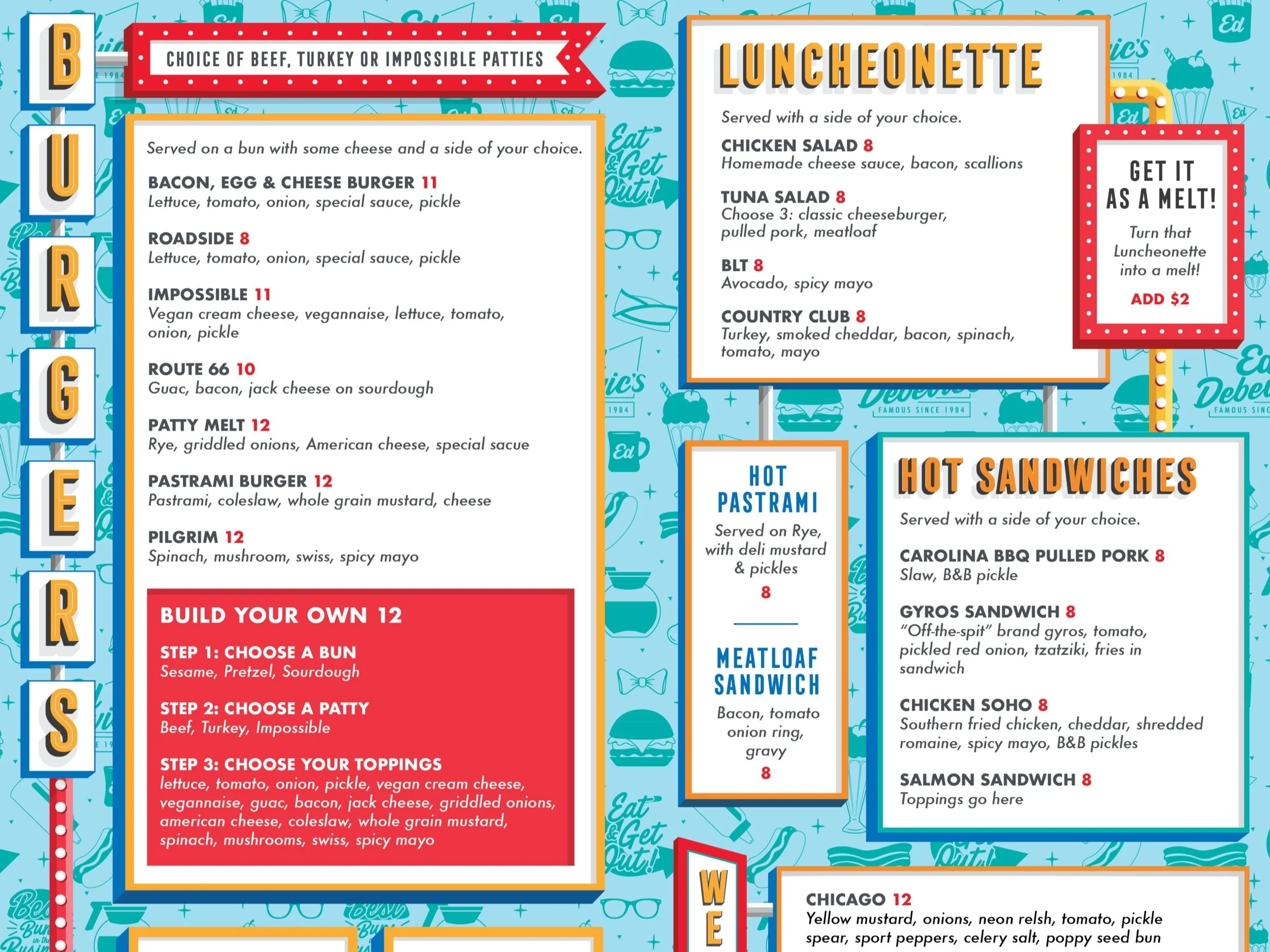 The color palette I chose for Ed’s was simple. Teal to pay homage to the original restaurant’s interior, red for their classic baskets and mustard for, well….mustard!