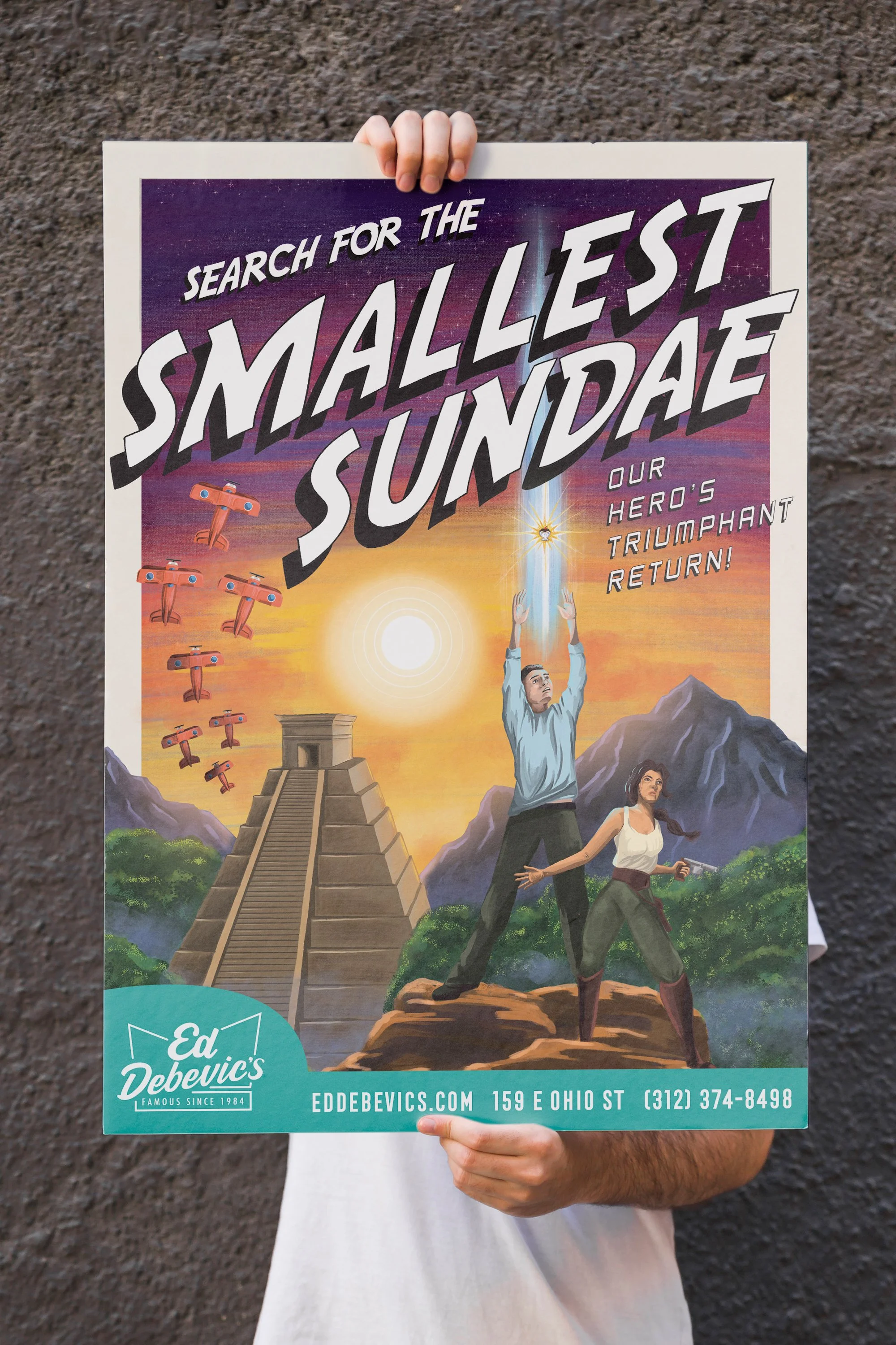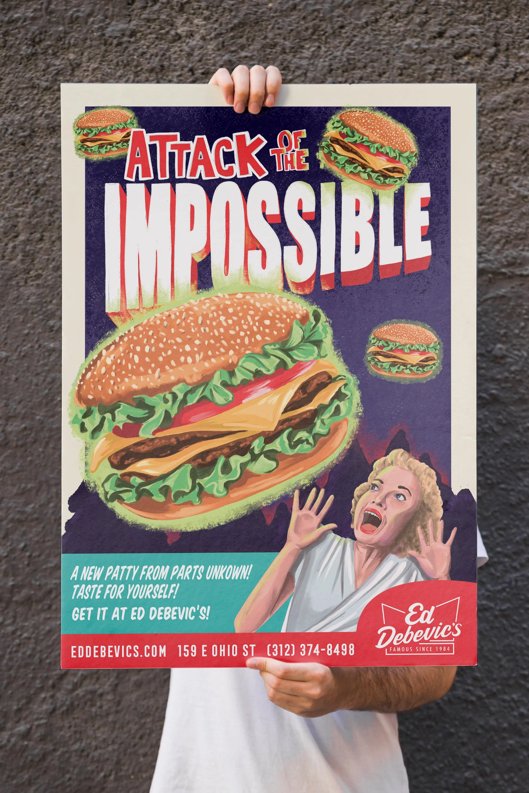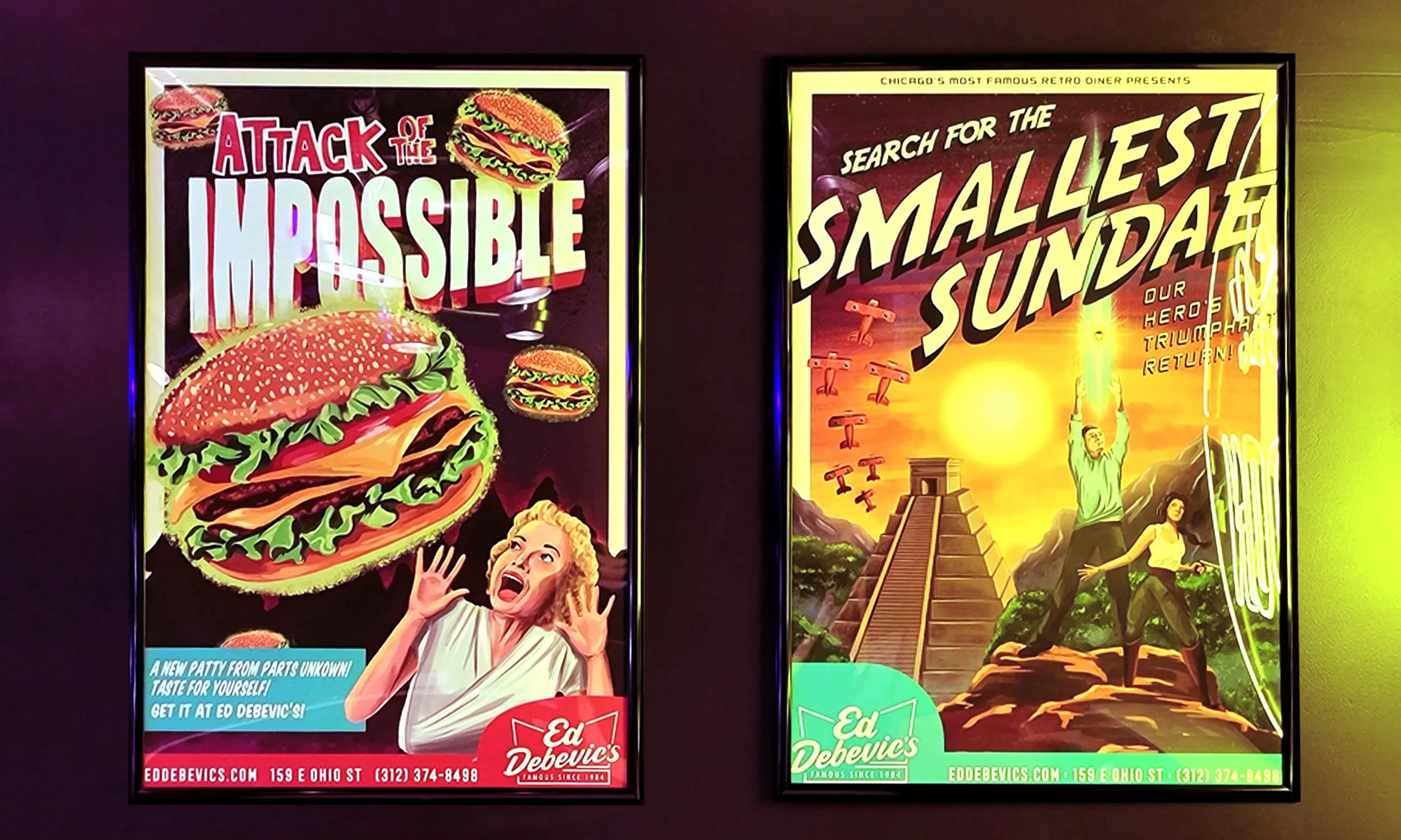 I was tasked to create two large illustrated posters to help promote some of Ed Debevic’s food items. I drew inspiration from 50’s and 60’s movie poster design.