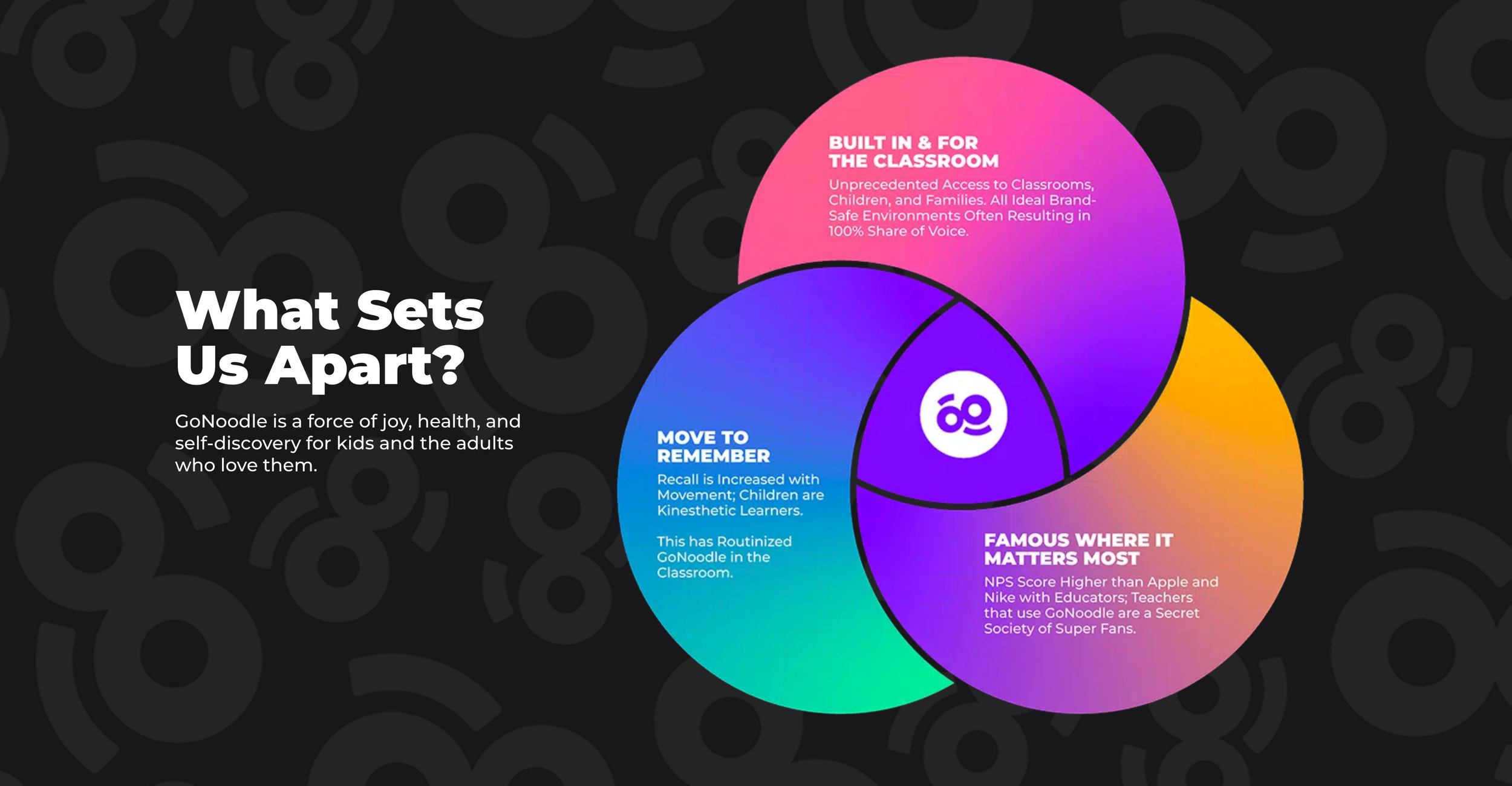 Measurable results are key to the GoNoodles’ approach. The challenge here was figuring out methods to break up stats and figures into digestible moments potential investors could fully take in.