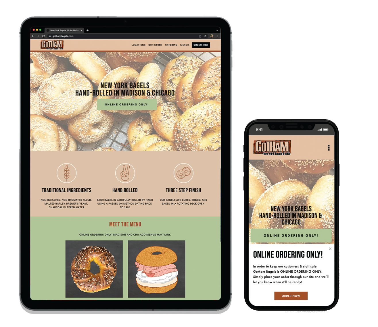 Gotham Bagels, the best bagels in the midwest, wanted to refresh their brand identity ahead of their expansion to Chicago. The identity refresh included the creation of a secondary logo, a new website, icon design, merch design and more.