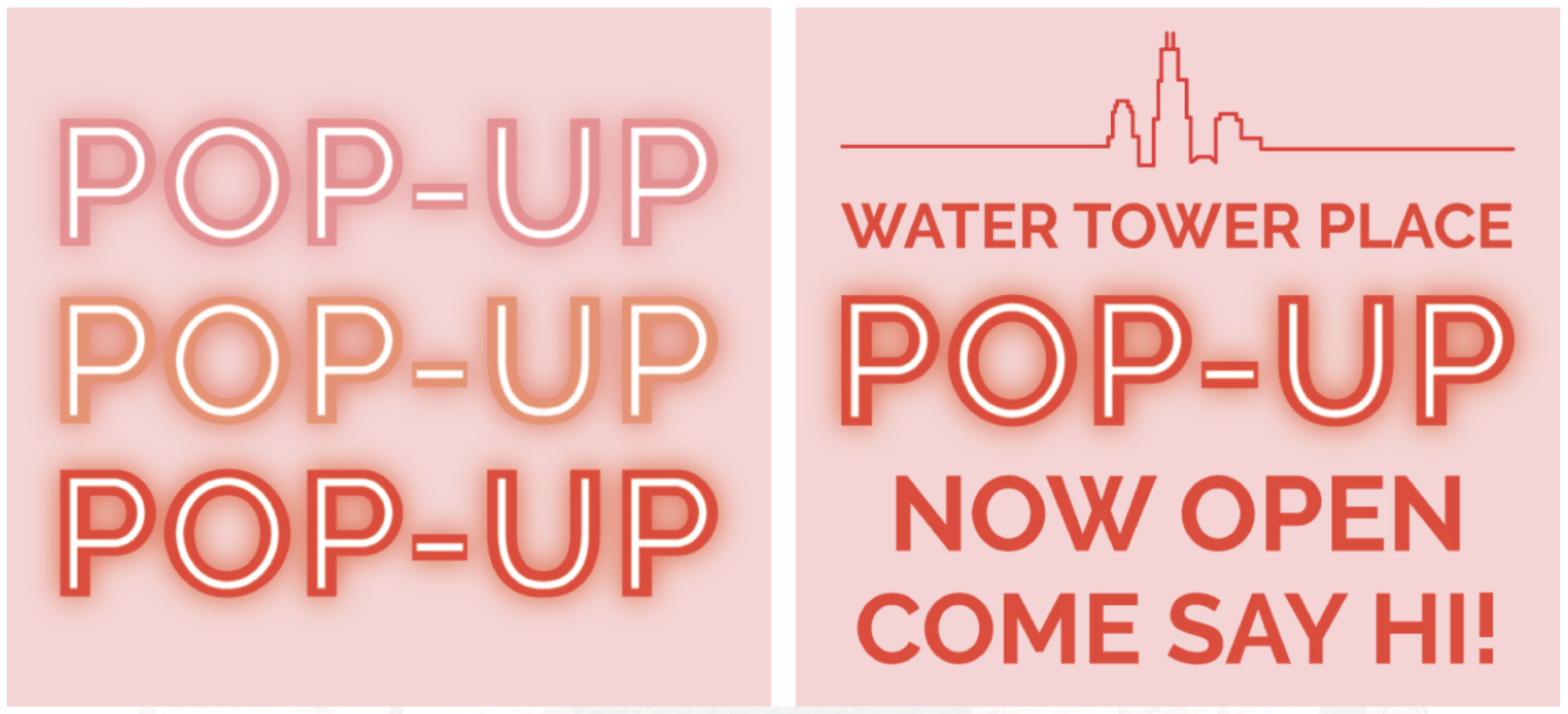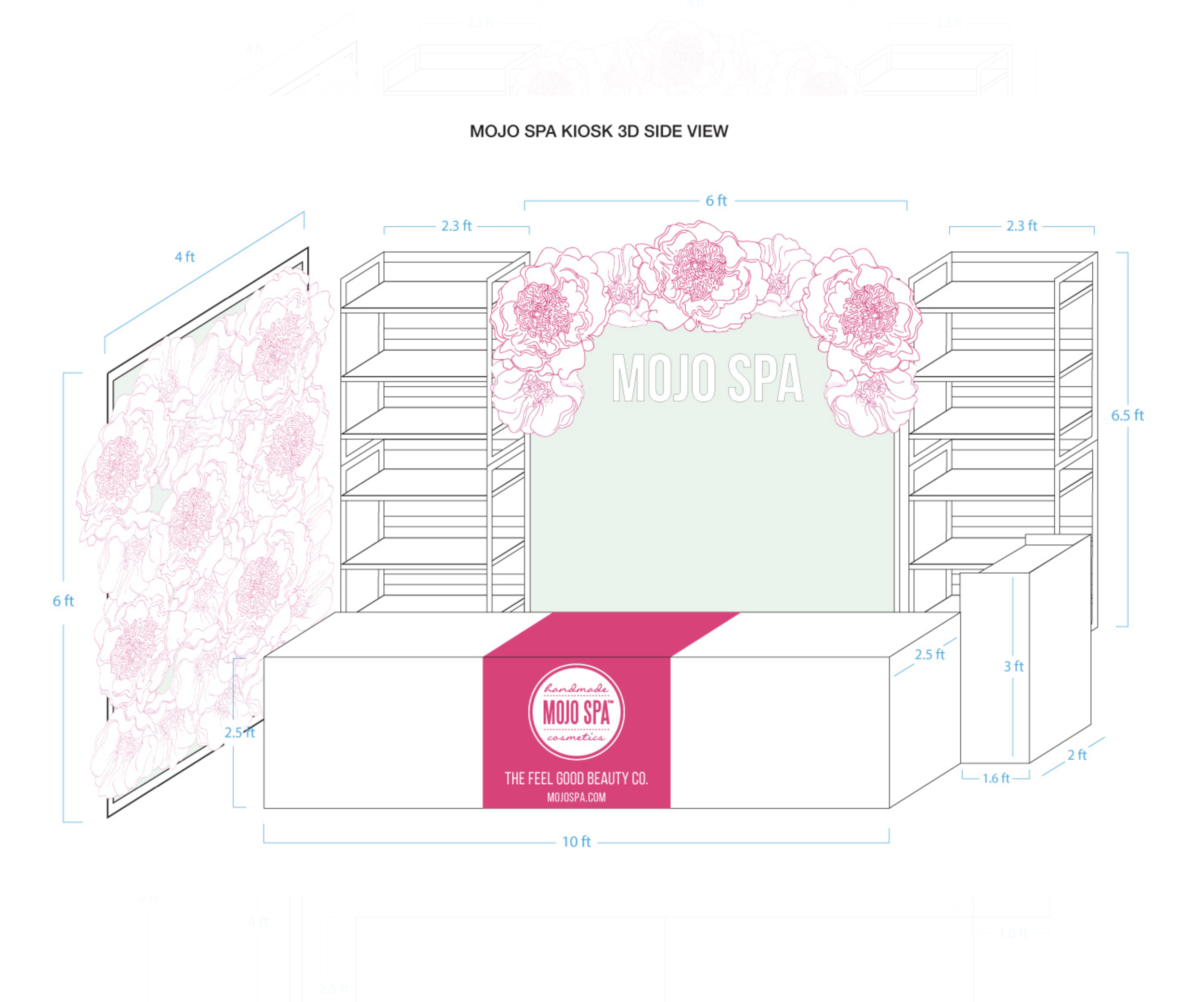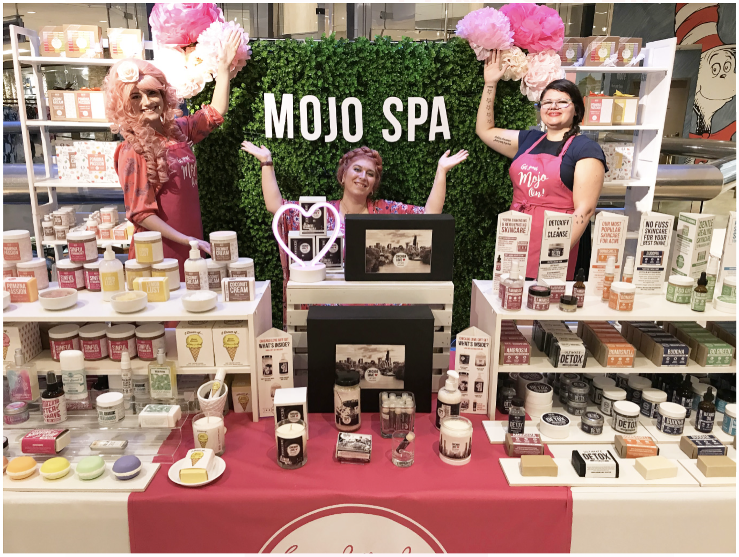 Mojo Spa was invited to hold a pop-up shop at Water Tower Place over the summer. For this pop up I was able to explore creating a mini version of our flagship store in the middle of a busy shopping mall. We wanted to emphasize the fun and handmade aspect of the Mojo Spa brand so we created a flower and topiary wall to create an environment for customers to shop in.